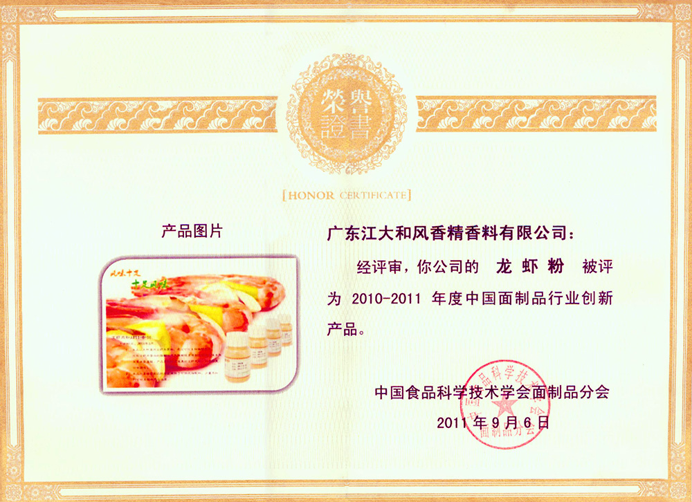 2011年獲得中國(guó)面制品行業(yè)產(chǎn)品創(chuàng)新獎(jiǎng)